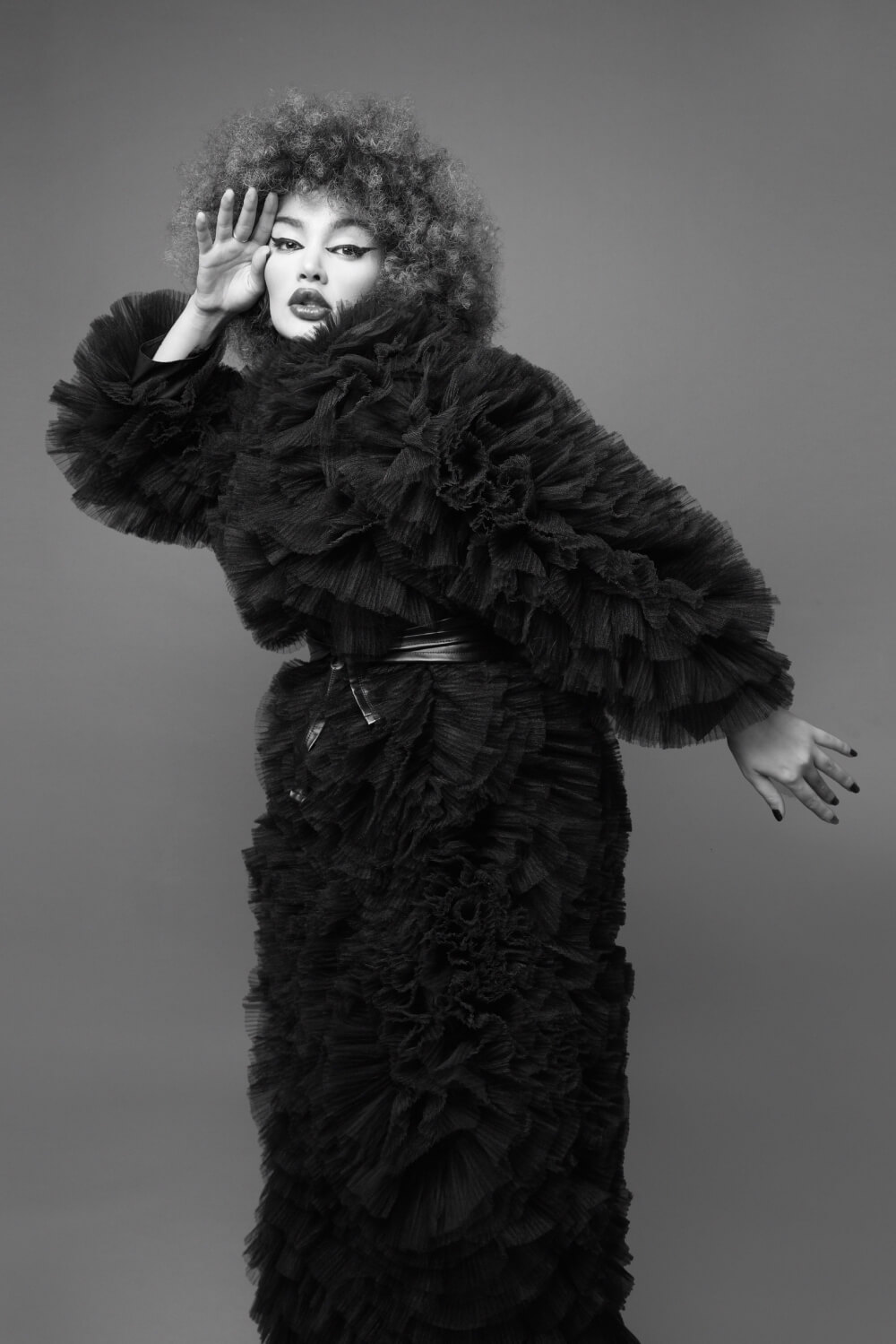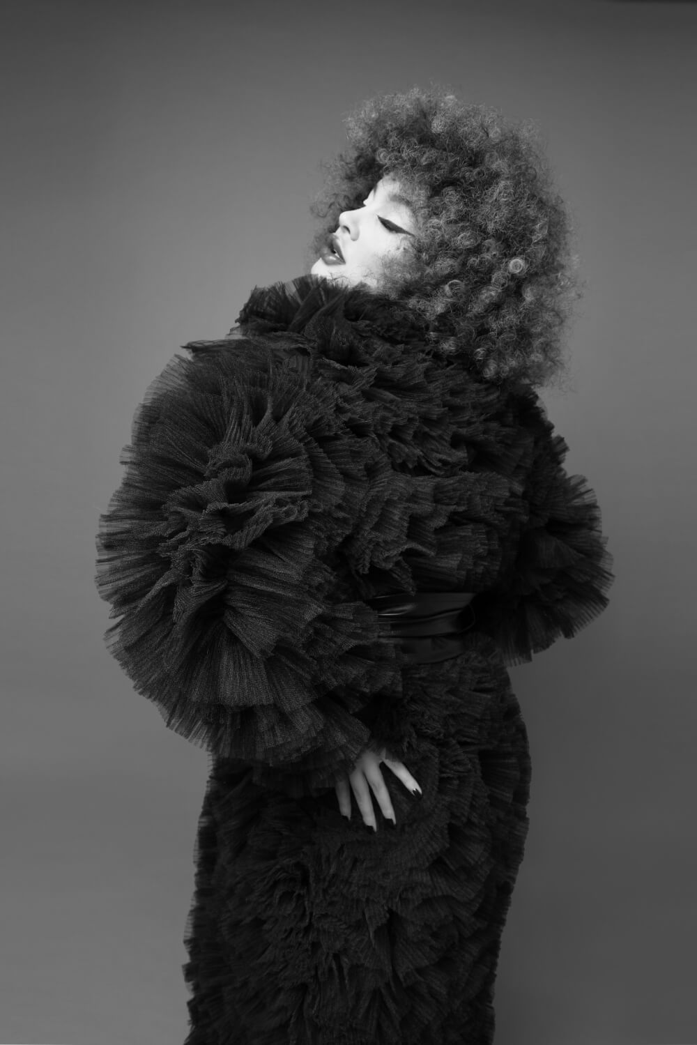 An elongated silhouette crafted in crushed plissé tulle, sculpted gracefully at the waist before pooling elegantly to the floor.