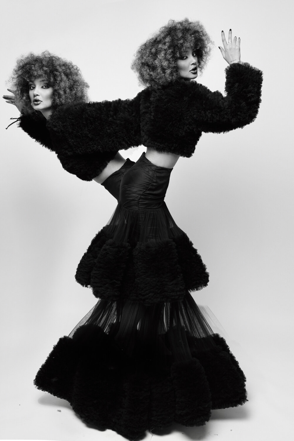 A striking two-piece ensemble combining a cropped faux-shearling bolero with a floor-length crushed plissé mermaid skirt—designed for dynamic texture play and sculptural elegance.