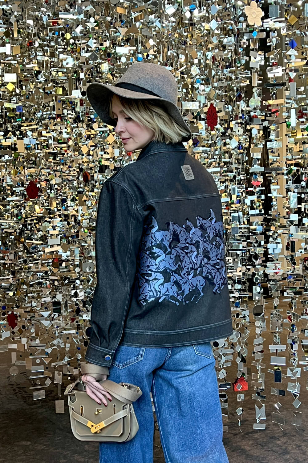 Dark denim jacket with horse motifs embroidered in silk