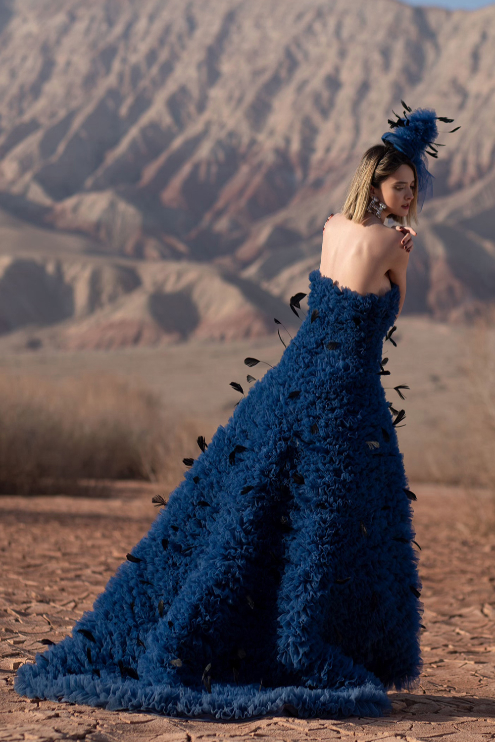 Be the first to review “Elegant dark blue hand ruffle/pleated long maxi evening dress with tail- single black feathers protruding throughout design” Cancel reply