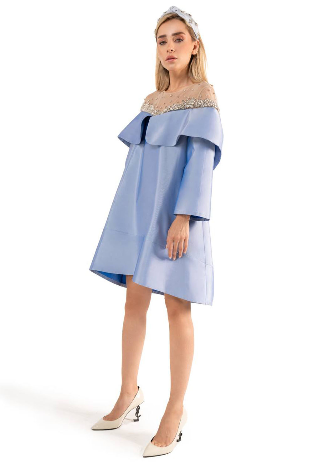 Light blue raw silk loose short dress with 3/4 sleeves – Swarovski stone embroidered top on see through fabric