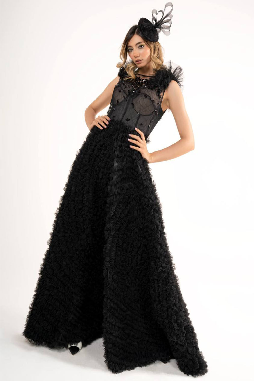 Long black evening dress- upper body seemed corset with black stones- full skirt with pleated frills all over