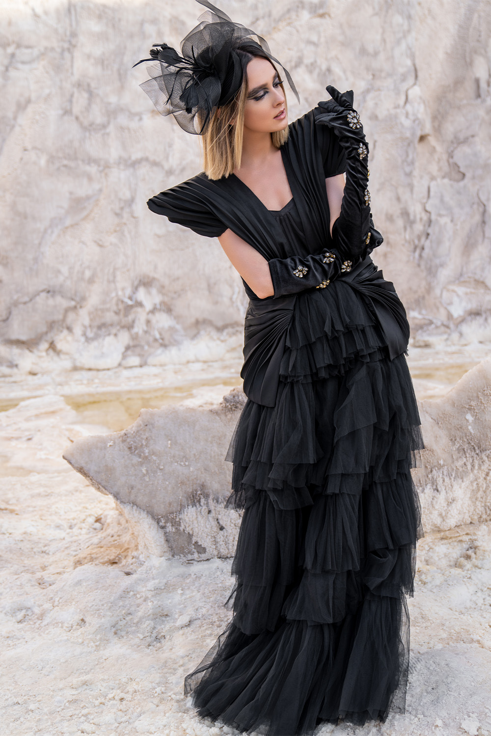long black tulle dress with its modern haute couture jacket