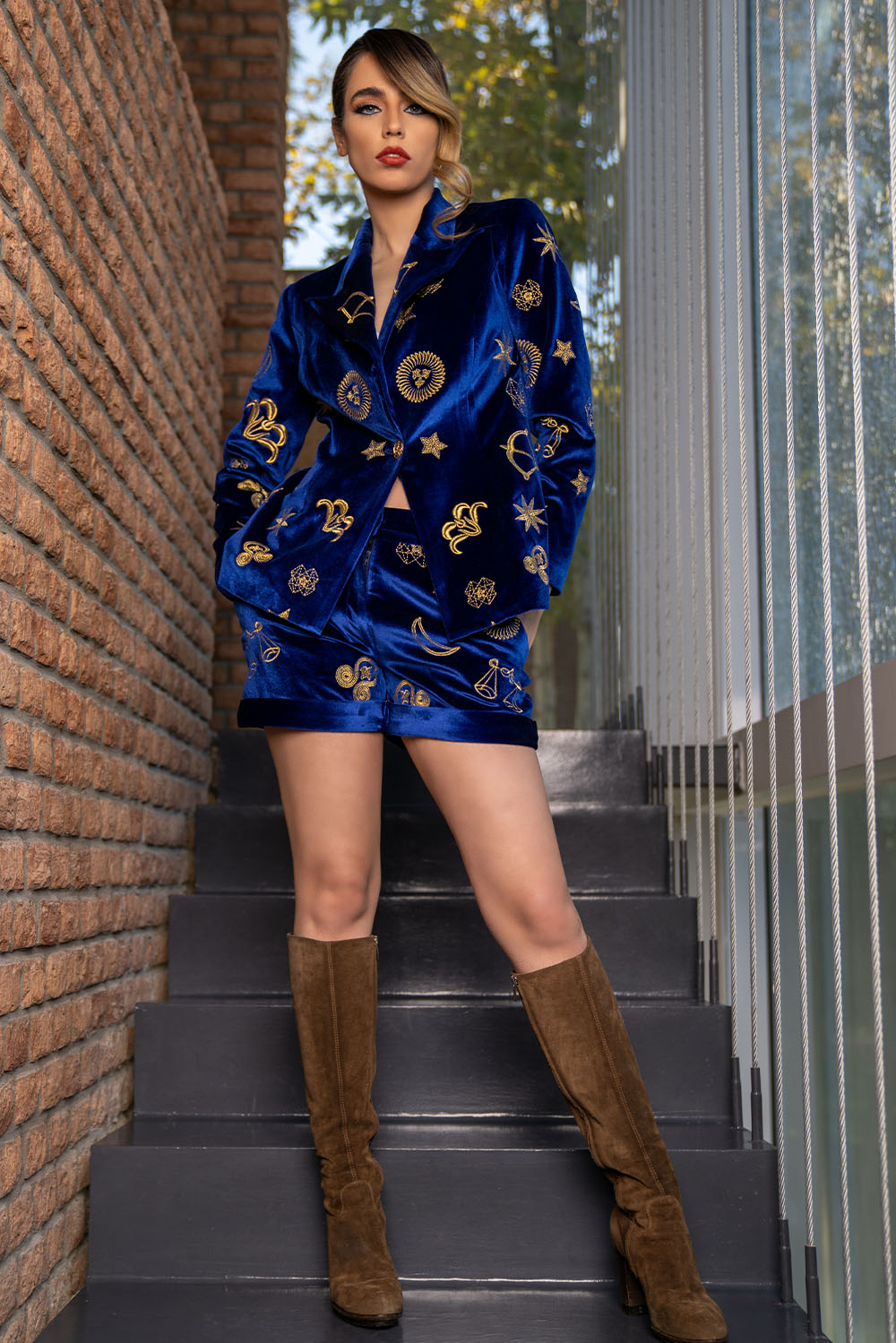 Royal blue velvet shorts suit – with gold embroidered symbols all over