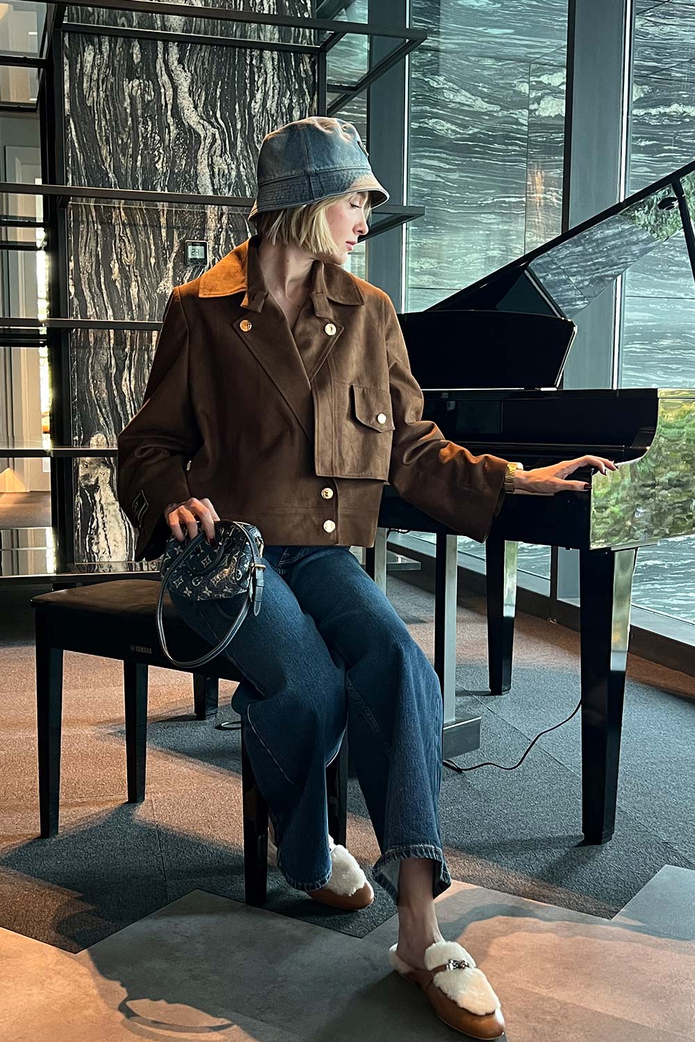 Short suede bomber with pleated back with signature golden button