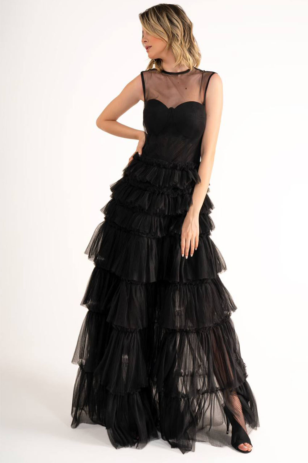 Sleeveless full length black evenning gown – full frill skirt with upper fitted corset and mesh top