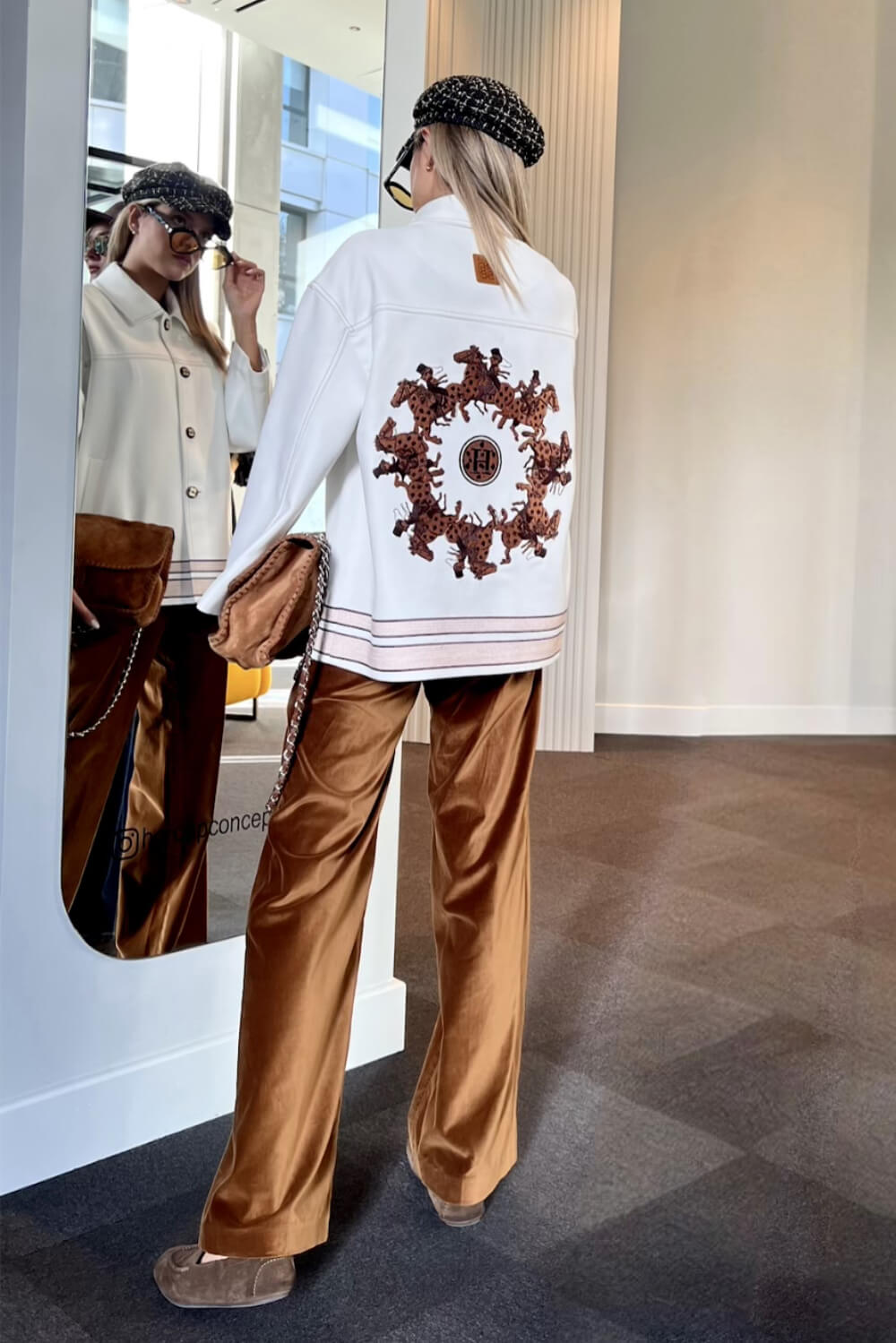 Be the first to review “White denim with silk embroidered horse motifs and signature logo in gold” Cancel reply